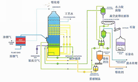 Wet flue gas desulfurization is the flue gas desulfurization technology which is most widely used and is the maturest technology in flue gas desulfurization technology.Wet flue gas desulfurization is to wash flue gas with slurry agent at the end of the flue. The desulfurizer and desulfurization products shall be wet. The reaction shall be carried out in solution. The calcium has a high-usage. The desulfurization efficiency can reach to 95% which is the first selected desulfurization process of domestic and overseas large size boilers at present. The main process:limestone, lime-gypsum method has got a further improvement, development and enhancement and it's gradually matured.The feature includes high desulfurization efficiency, high-usage, simple process and low system energy consumption, etc.The wet flue gas desulfurization process mainly includes limestone, lime-gypsum method, simple wet FGD, TFGD, seawater desulfurization technology,magnesia FGD process, wet ammonia flue gas desulfurization(FGD) process,lime-magnesium method and oulopholite method, etc. The adopted desulfatization base includes calcium base, magnesium base, amino base and sodium base desulfurizer, etc.